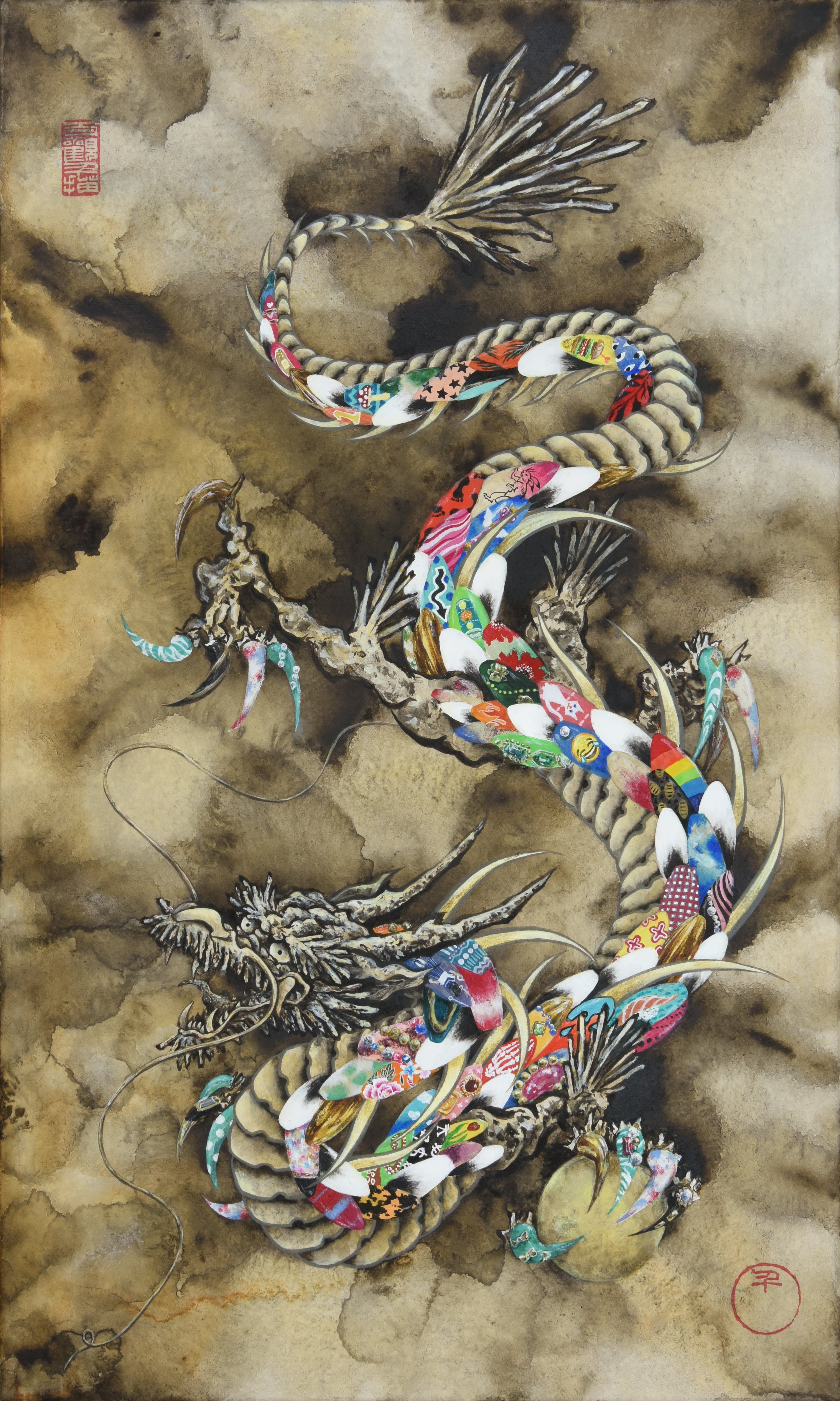 ネイルアートは自分の好きなカラーで楽しむためのファッションであると同時に、自身の意思を示し、また、自然界における身を守る鎧のような機能を持ち合わせていると考えます。全身にネイルを纏う龍が強くおおらかに舞う様子が描かれています。