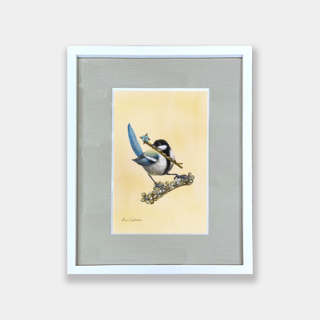 繁栄の象徴であるシジュウカラが、宝石でおめかししている様子を描いた作品です。