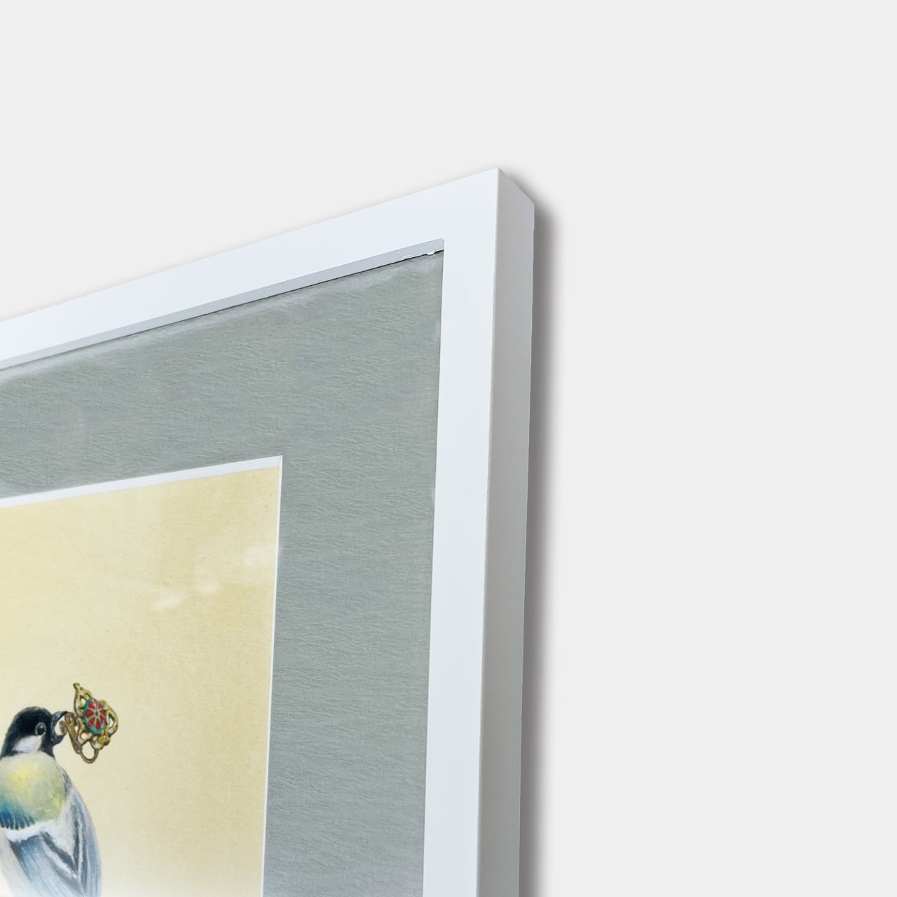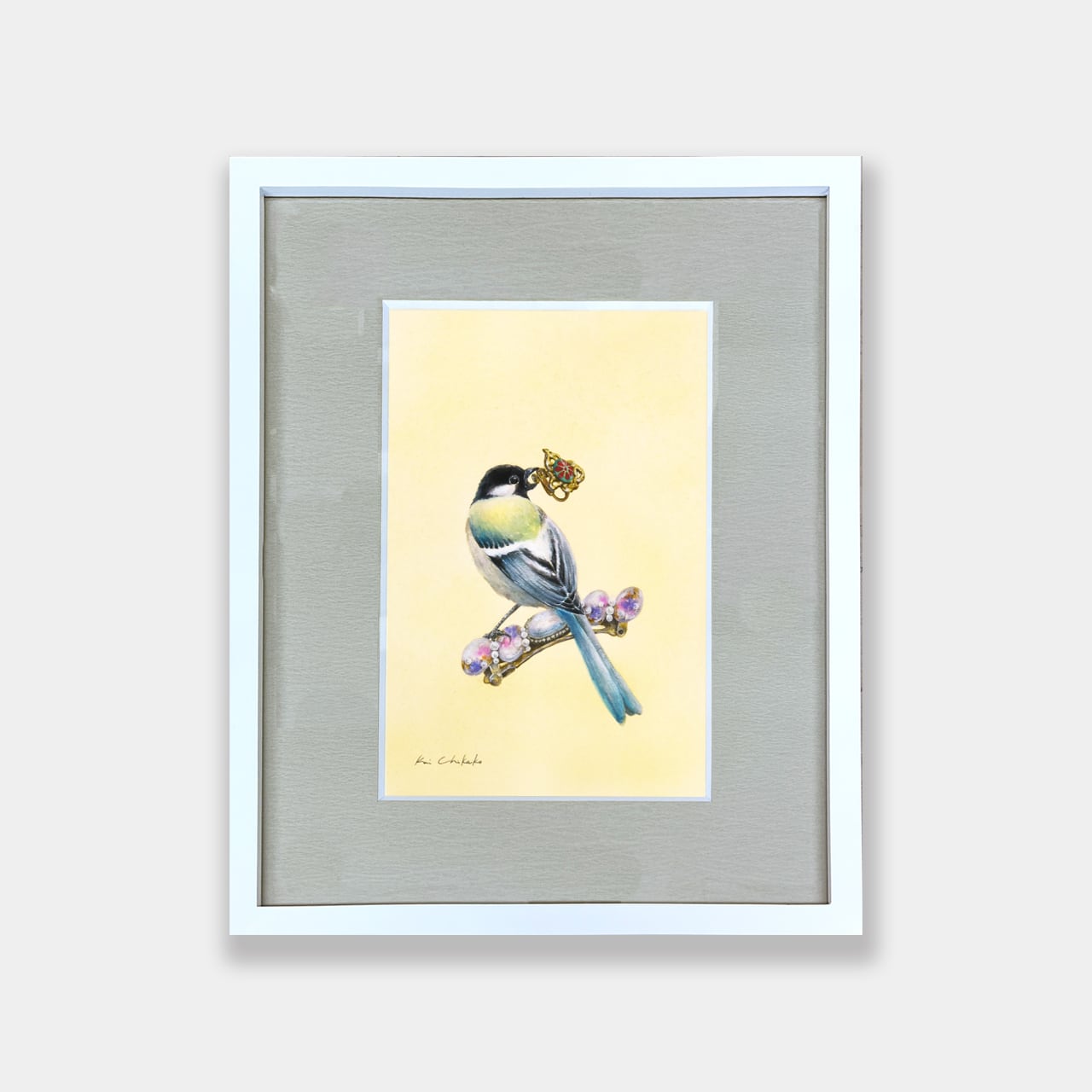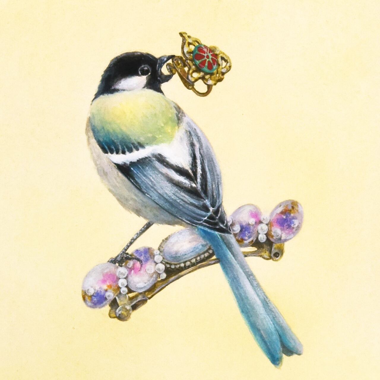 繁栄の象徴であるシジュウカラが、宝石でおめかししている様子を描いた作品です。
